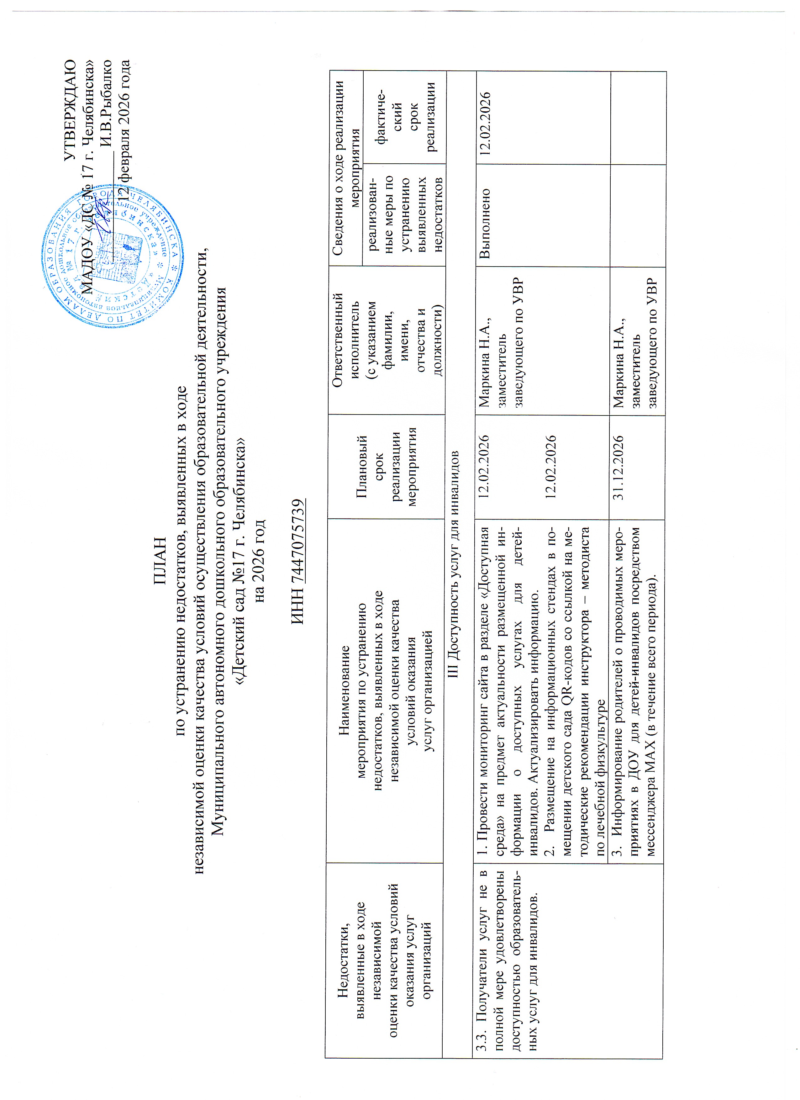 План по устранению недостатков, выявленных в ходе независимой оценки качества условий, осуществления образовательной деятельности МАДОУ "ДС №17 г. Челябинска" на 2026 год