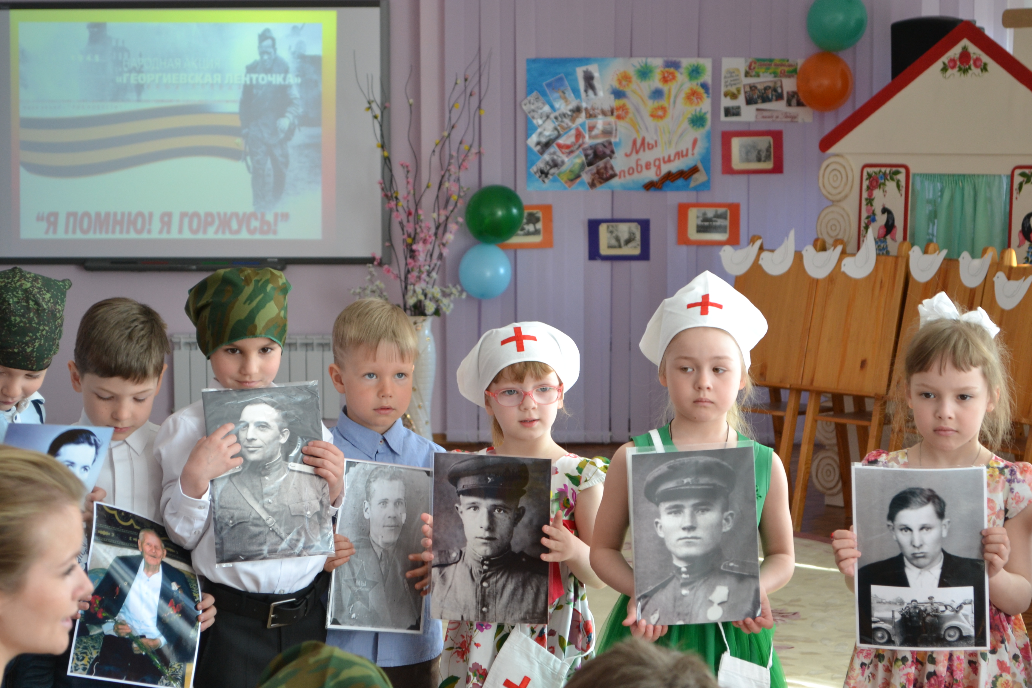В нашем детском саду большое внимание уделяется патриотическому воспитанию. С этой целью в преддверии праздника Дня Победы прошел торжественный праздник на котором педагоги рассказывали детям о празднике, о героях Великой Отечественной войны, о подвигах людей на фронте и в тылу, были оформлены выставки детских работ,вспомнили своих родных ветеранов (дедушек и бабушек)