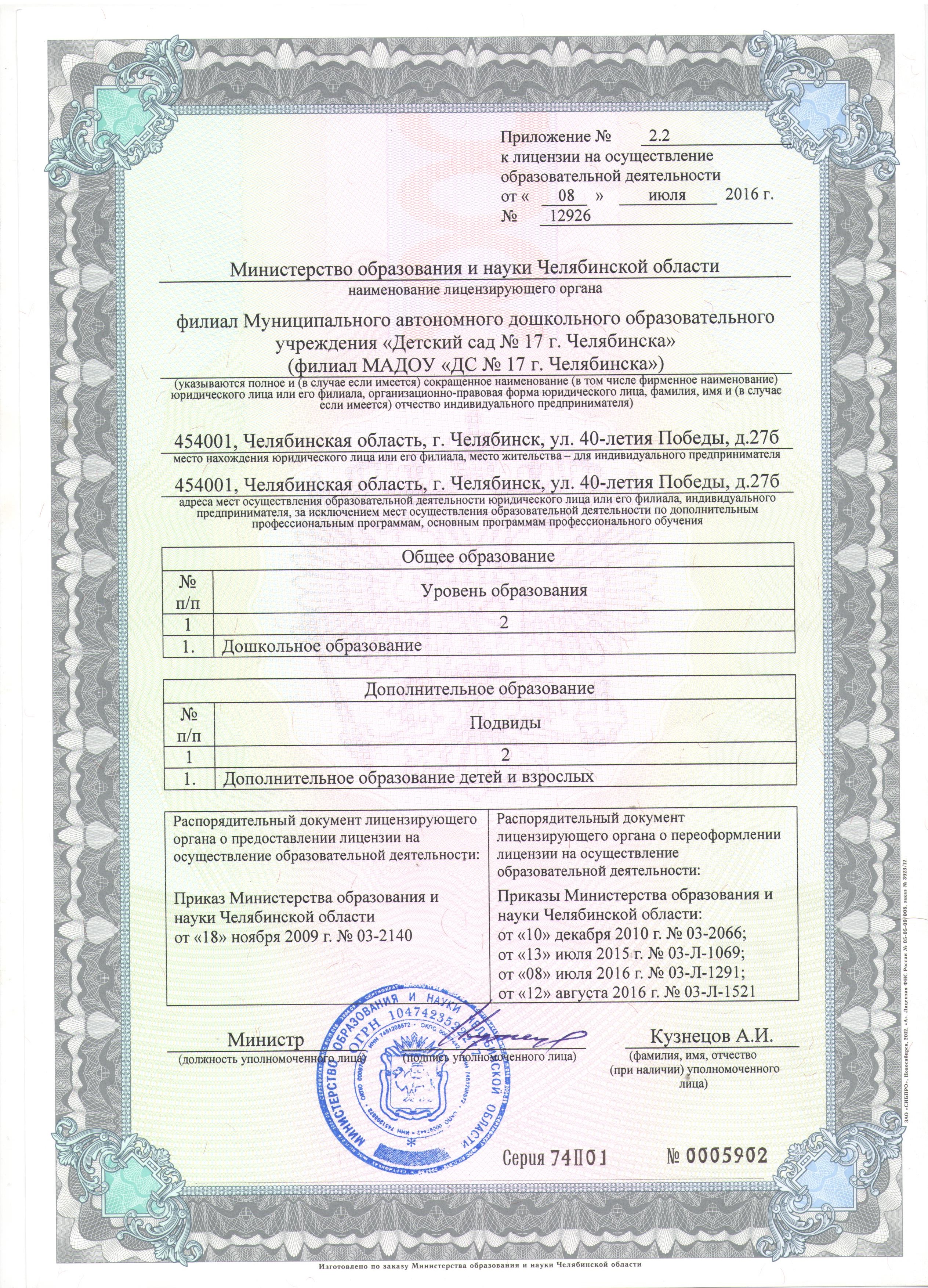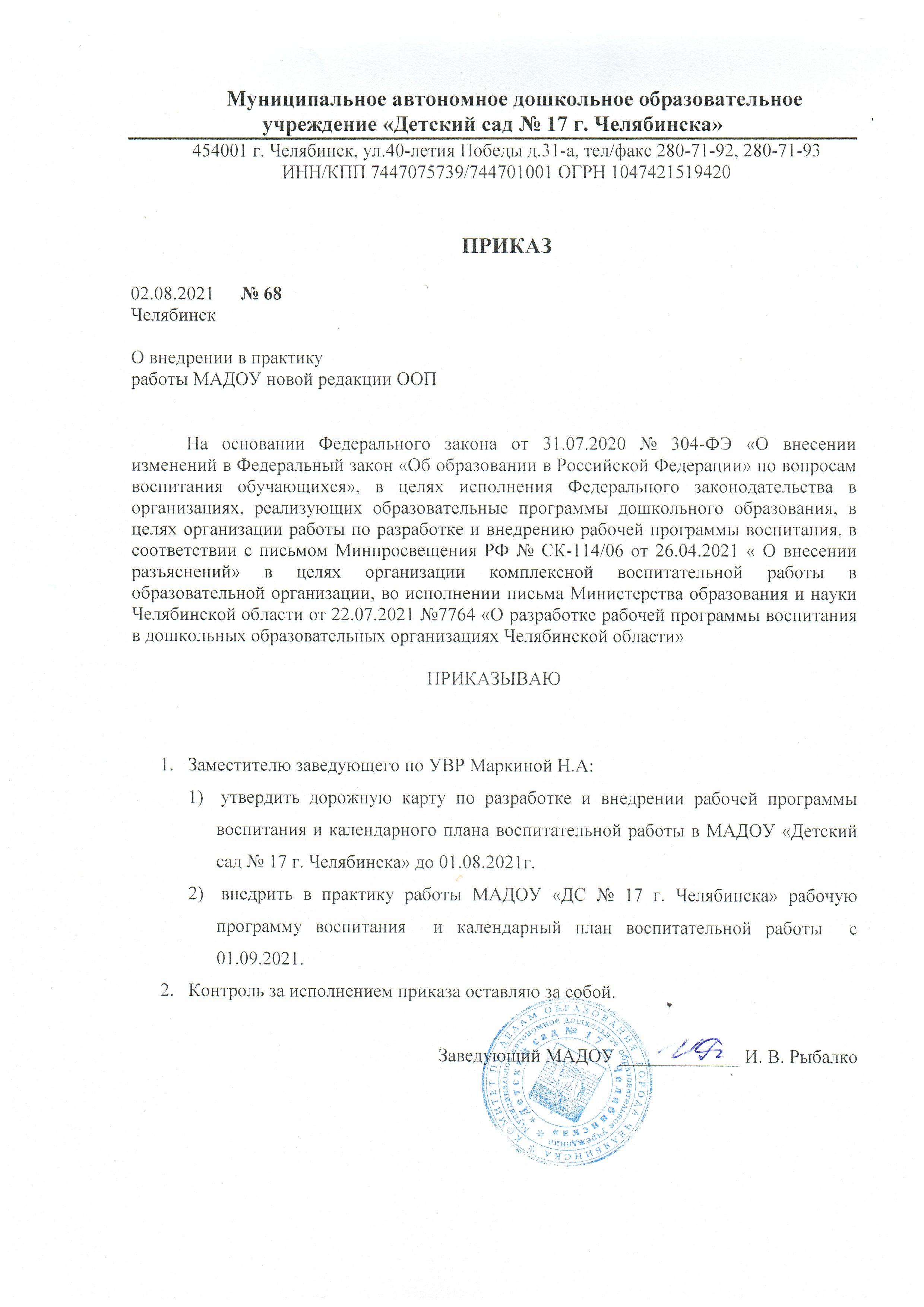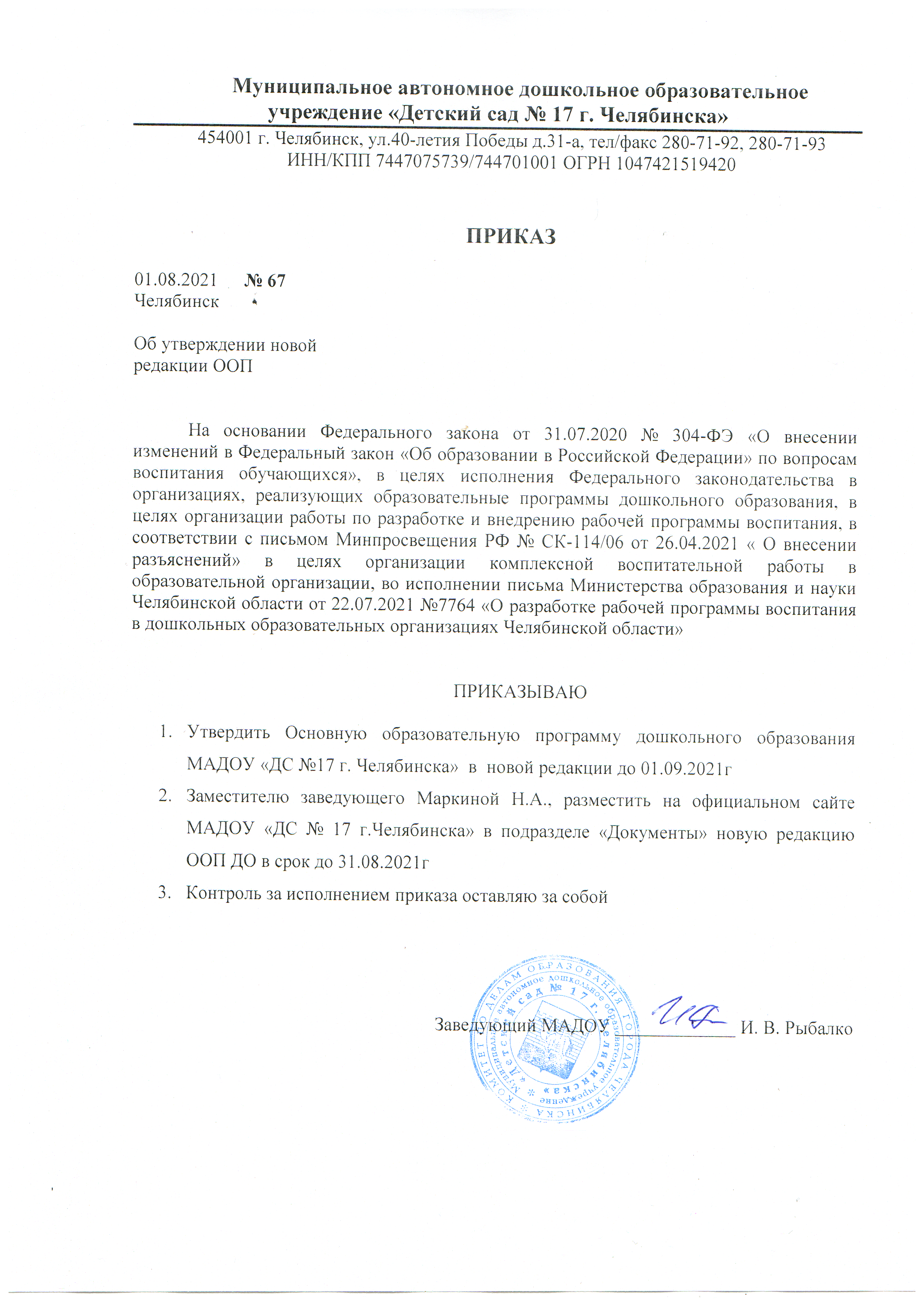 Приказ об утверждении новой редакции ООП МАДОУ "ДС №17 г. Челябинска"