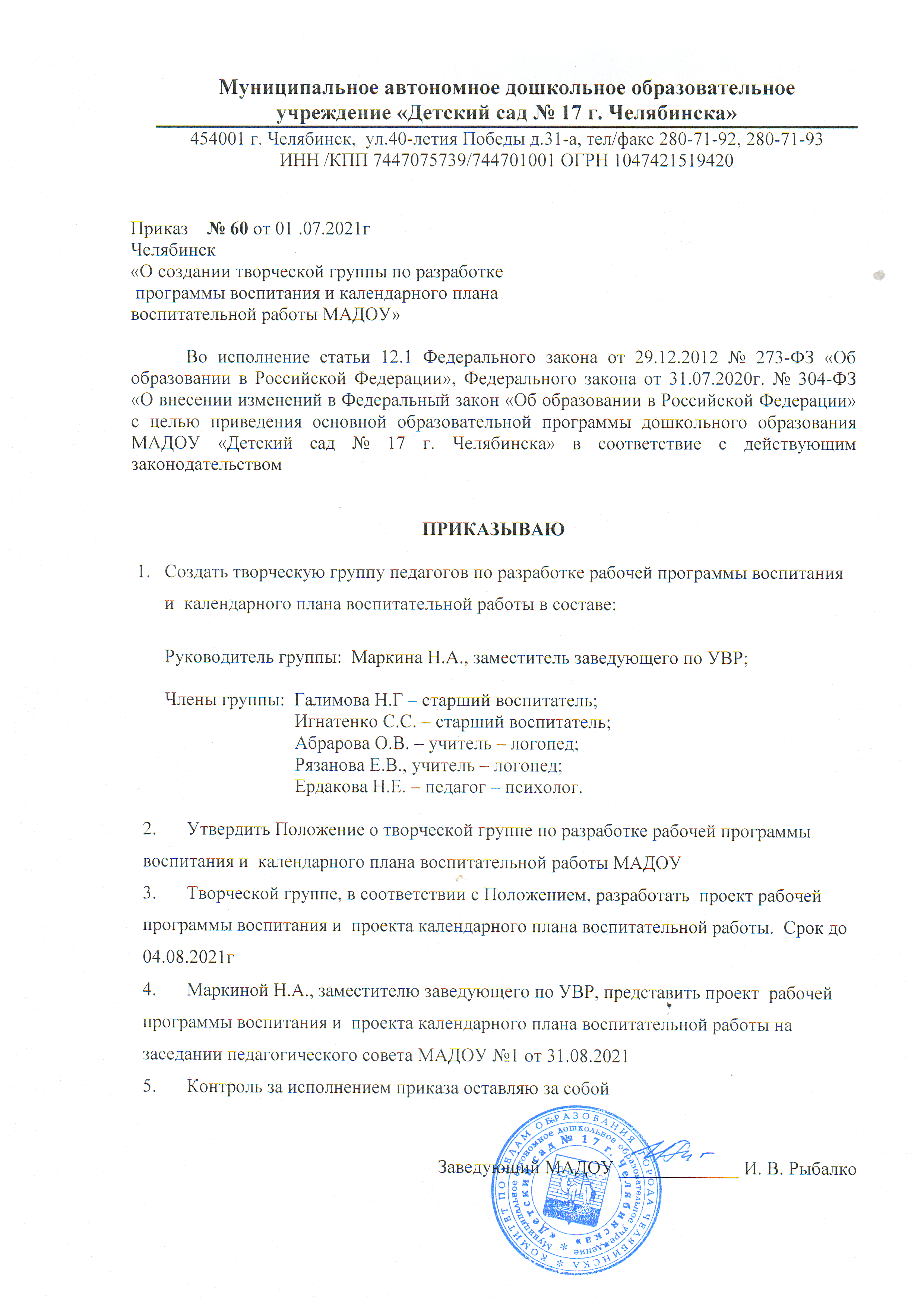 Приказ "О создании творческой группы по разработке программы воспитания и календарного плана воспитательной работы